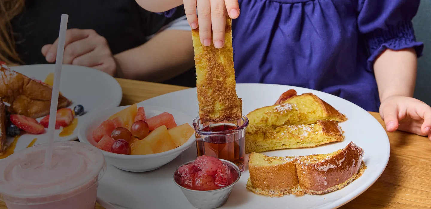 Every kids meal allows your child to choose 1 Entrée (like Pancakes or Chicken Strips), 2 Sides (like Bacon, Fruit, or Fries), and 1 Drink (Milk, Juice, or Lemonade). This "Build Your Own" style ensures even picky eaters find a combination they love.